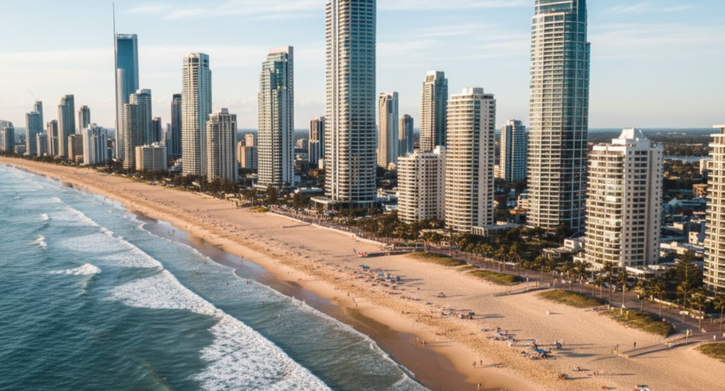 Nearby attractions include the Gold Coast Esplanade, beachfront shopping zones, and several well-known theme parks located a short drive away.